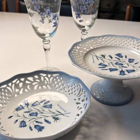 Blå klokkeblomst - Christineholm stel dele i hvid og lys blå