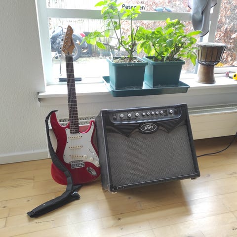 Elektrisk guitar med forstærker 220 volt. God stand .kabel til forstærkeren mangler.