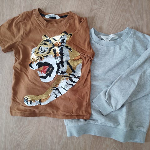 1. H&M. str. 110 - 116. brun m smukkeste tigerhoved i pailletter. som ny. kr. 80