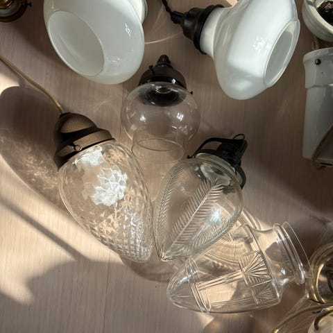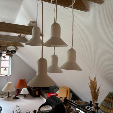 Pendel, Retro, Fire orange-røde pendler med porcelænsfatninger, forbundet med velholdt sort stofledning.