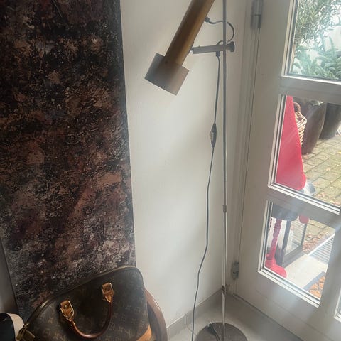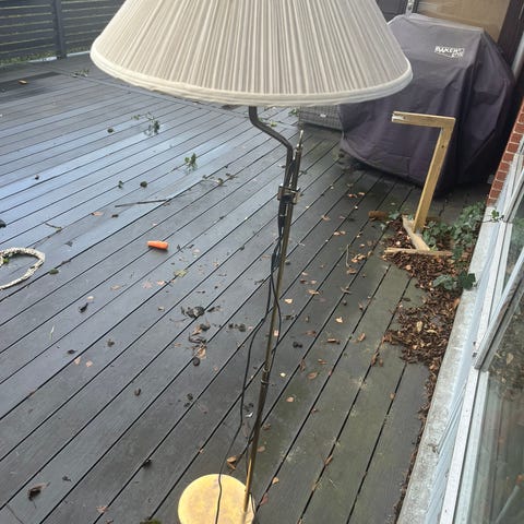 Skærmen er fine uden buler og lampen fremstår i sin helhed velholdt, dog er den ene holder knækket, så enten kan man fjerne den ene lampe, eller også skal man finde en ny holder