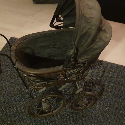 Fin kurv dukkevogn. L17cm B. 15cm.