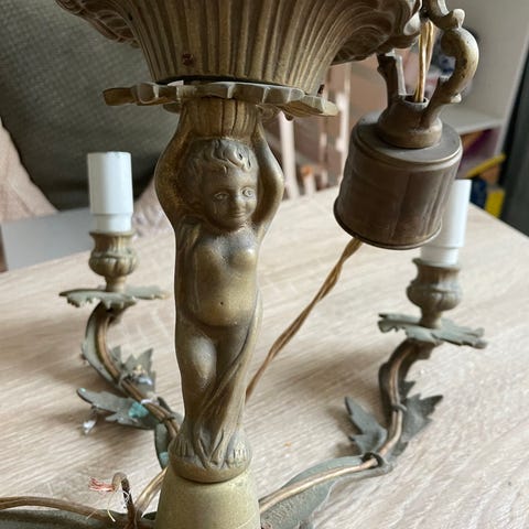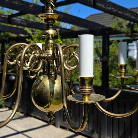 2 messinglysekroner i Empire stil fra samme fabrikant. Den ene med 6 arme og 3 kæder og den anden med 8 arme og 4 kæder. Sidstnævnte skal blot have fastgjort fatninger igen. Så burde den være fin. Den anden har glaskranse rundt om fatningerne og nogle af disse er defekte. Har set de kaldes Karl-johan i Sverige. Det er en slags kongekrone som er baldakin, så det giver lidt mening.