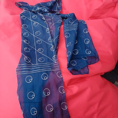 Tørklædet er aflangt, med "flosset" kant i enderne, og fast kant på de lange sider.