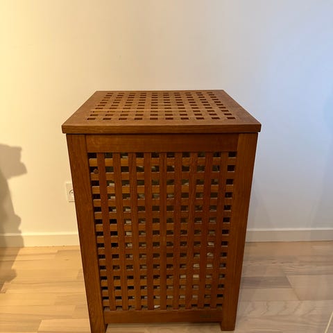 Elegant og solid vasketøjskurv fra Trip Trap Denmark (nu Skagerak) i sortlakeret træ med gitterdesign og låg. Medfølgende aftagelig stofpose i kraftigt bomuld, der sidder fast med trykknapper og messingøjer. Kædeophæng i låget og originale messinghængsler.