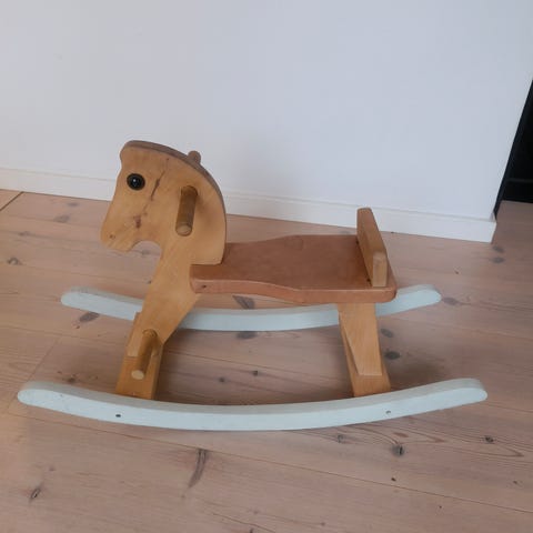Fin og flot gyngehest med alm. brugsspor. Den er i 100% træ.