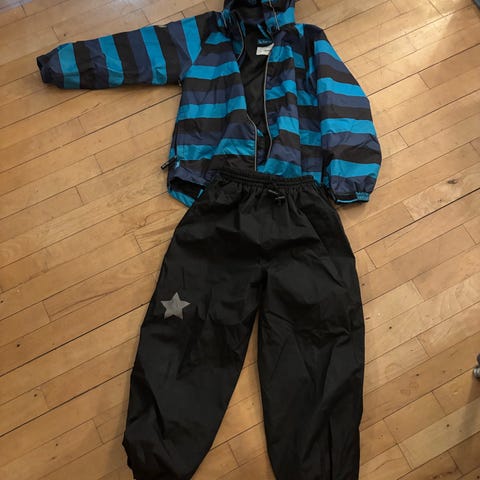 Rødlig regnjakke fra Fair Tail i str. 8 / 128 med rød, lyselilla og mørkelilla striber. Den har en aftalige hætte. der er elastik og velcro ved ærmerne. den kan strammes ind i livet. den har en stjerne refleks bagpå