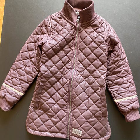 Quiltoverflade og stribede ribkant i kraven, ved ærmerne og underkanten.