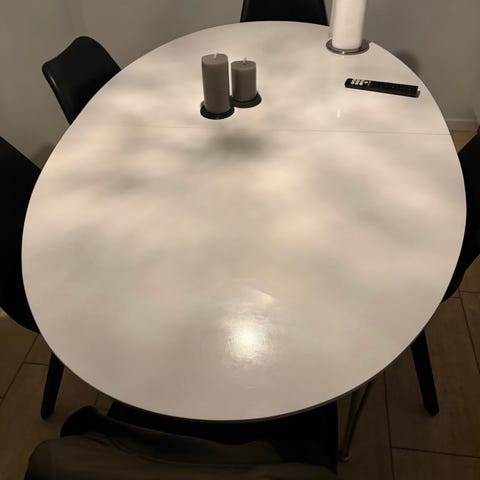 Sæbebehandlet ovalt bøgebord med lettere brugs spor. Kan forlænges med 2 tillægs plader.