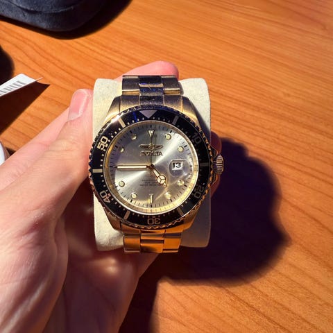 Producenter:InvictaModel:8928OBSerie:Pro DiverTyp:Herreur, Dress / SportmodellDiameter:Ø 40.00 mmTykkelse:14.00 mmVægt:155 gramUrkasse:Børstet/poleret stålArmbånd:Børstet og poleret stål gul guldtonet stålUrskive:Blå med selvlysende mærker indeksmarkeringer, selvlysende visereSpænde:Foldespænde i stålGlas:Mineral, brudsikkertBezel (krans):Gul guldtonet stål, blå, roterende mod uret