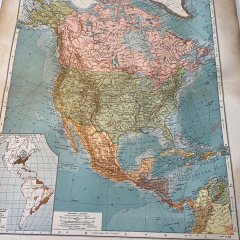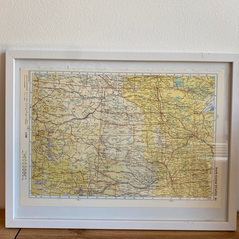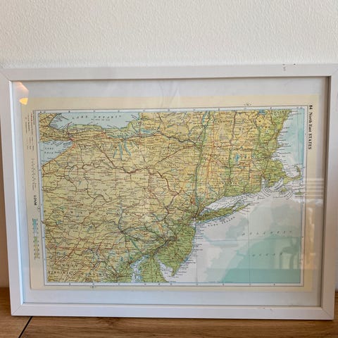 Flot og farverigt USA landkort i rød ramme og annekdoter rundt i kanten. 60x88 cm