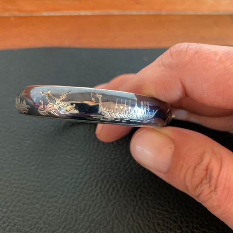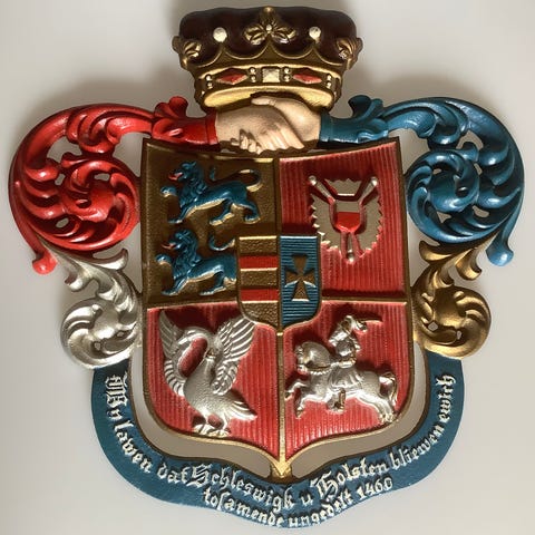 Gammelt . Skjoldet er 4 delt med ramme , øverst løve med krone og i de 4 felter løve , bjælker, 3 ænder, 3 fuglehoveder og en ørn i midterfeltet . Større print i guldramme ( 19cm x 14,5 cm inkl ramme), printplade i metal og ca 150 løse print 6,8 cm x 8,9 cm (næsten som nye)