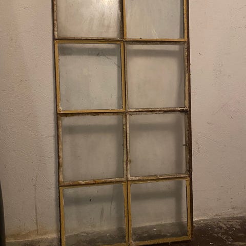 Gamle vinduesramme lavet af metal med glasruder. Rammen har en buet top og består af flere små glasfelter opdelt af metalrammer. Farven på metalrammen er rødlig med tydelige tegn på aldring og slid. Kan anvendes til restaureringsprojekter eller som dekorativt element.