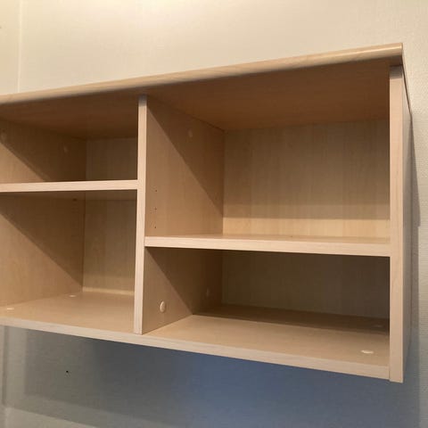 Fine reoler som kan monteres på væg. Har almindelige brugsspor samt lille hul i bagpladen på den ene reol.