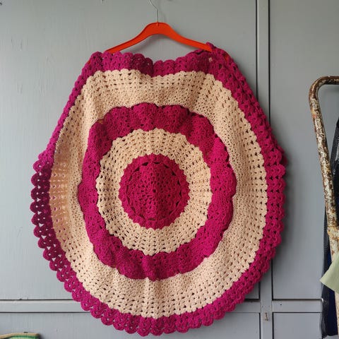 Lækker blød og luftig poncho i skøn farvekombination i blålig og rosa toner, hæklet i Twils Deluxe 100 % bomuld.