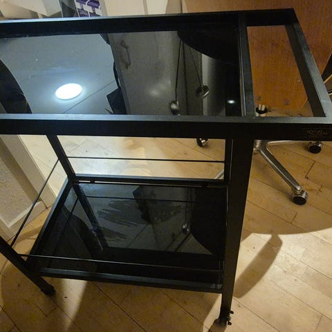 Norma rullebord i et elegant design, lavet af metal og hylder i glas.