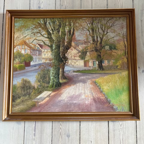 Fint lille maleri fra Herstedøster med Herstedøsterkirke i baggrunden. Måler: 42 x 30 cm incl ramme.