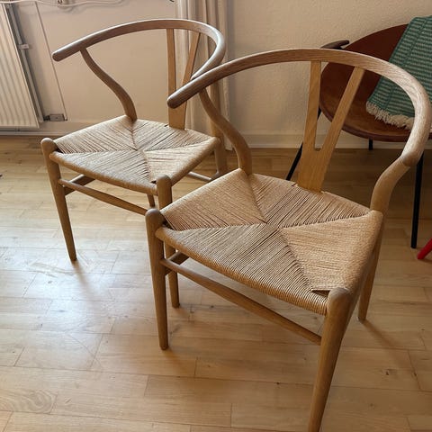 Carl Hansen CH24 Wishbone stol designet af Hans J Wegner. 8 stk. stol i sortmalet med naturfarvet flet sæde. Klassisk design med Y-formet rygstøtte og håndlavet fletning. Alle stole står uden pletter eller brugsspor pga. de altid har haft hynde på. Inkl. møbelsøm som giver stolen mulighed for at stå både på trægulv eller bløde tæpper. Sælges samlet.
