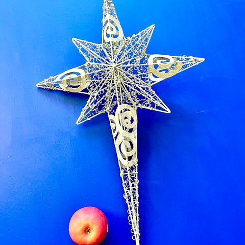 Julestjerne til ophæng, Fin lille julestjerne til ophæng i guldlignende materiale. Ikke ægte guld, formentlig en slags plastik/metal. Ikke brugt. Kom med et bud. Kan også sendes.