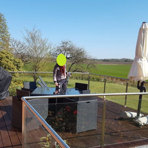 Mål står på sidste billede. Rækværket er 94 højt dertil bliver det forhøjet med 10cm når det kommer op på stolperne - opfylder lovkrav.