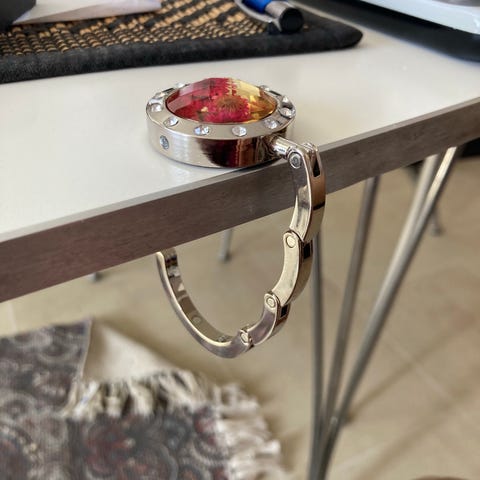 Bag holder, to be put on the table edge, hang your bag or carrying bag etc. on the hook and let go of dirty floors. Inclusive velour bag. Ideal girlfriend gift.