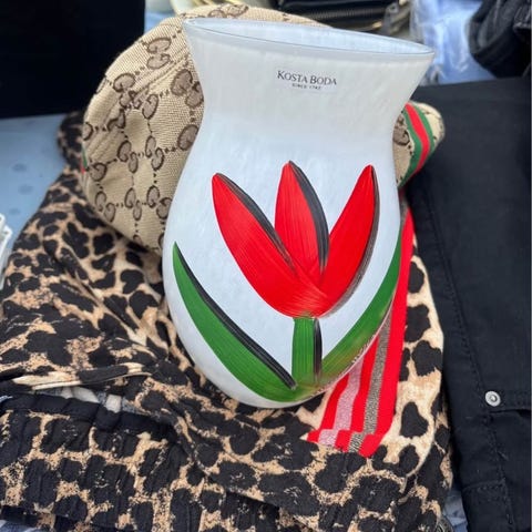 Utrolig flot og gedigne vase fra Kosta Boda - oval i facon - og i smukke grønne og gule farver. Den fremstår i flot og hel stand. Jeg sender gerne godt indpakket mod betaling af porto kr. 50.