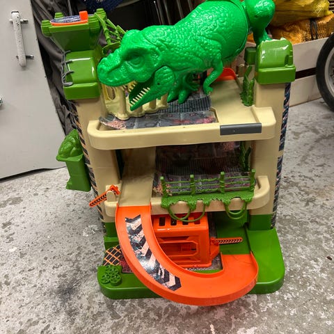 Kør om kamp for at slippe væk fra Jurassic World-øen i dette Hot Wheels RacerVerse-banesæt, der har en racerbane og en svævebane ved målstregen.