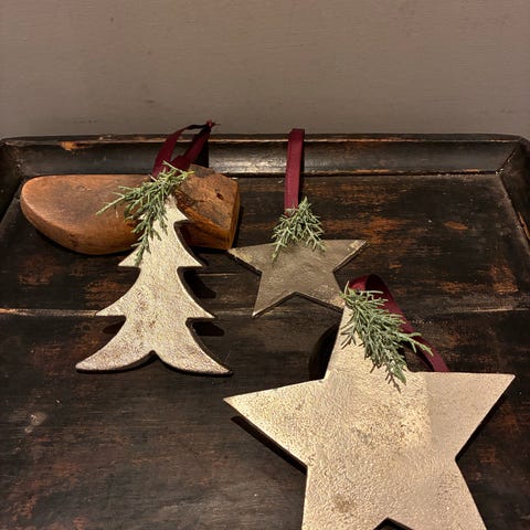 3 julehjerter i metal 4 x 4½ cm + hank/bånd. Kr. 15,-