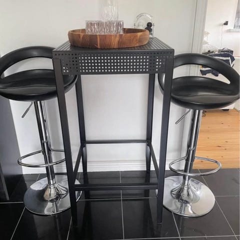Bordet har 4 kroge og en skuffe. Vi har selv tilføjet 5 krog der sidder fast med dobbeltklisterende tape, som kan fjernes.
