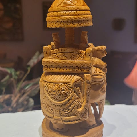 Håndlavet træ elefantfigur i brun farve. Figuren er detaljeret udskåret og fremstillet af træ, hvilket giver den et naturligt og autentisk udseende. Velegnet som dekorativt element i hjemmet eller som gave.