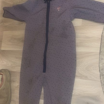 Et par usynlige småpletter, som sikkert kan tørres væk med vand og sæbe. Ikke forsøgt fjernet.