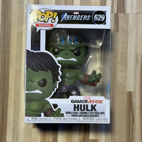 Avengers: Endgame Hulk Funko Pop 478 (6 inch). Kassen har meget få, mindre-synlige skrammer og figuren har været ude af kassen og stået til pynt, men er udover det I pæn stand.