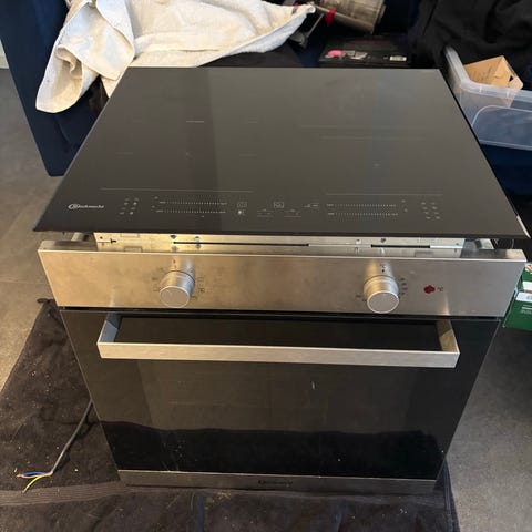 Induktionskogeplade med emhætte. Blev skadet under montering så glasset på højre side er revnet.