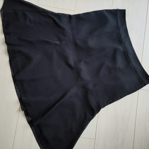 Nederdelen har et asymmetrisk snit med slids foran og lynlås i siden. Uden foer.