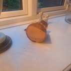 Kobber jydepotte og kobber ½ l kande, sælges samlet. H 11 cm, Ø 9 cm. Fast pris