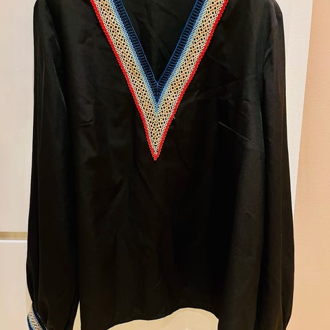 En sort bluse der bindes. Der er en lynlås til siden. Afhentes på nørrebro.