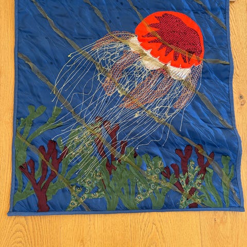 Indrammet Patchwork “Menneskenes Jord” af Ulla Brita Gregersen (1980)