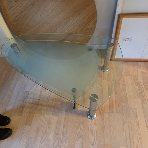 Sofa glasbord. Designet og produceret i Italien. Kan ikke huske det nøjagtige mærke, men noget med Schopenhauer. Tyk (og tung) glasplade med nogle få brugsridser. Der skal 2 til at løfte den. Fedt bord, fedt design og virkelig godt kram.