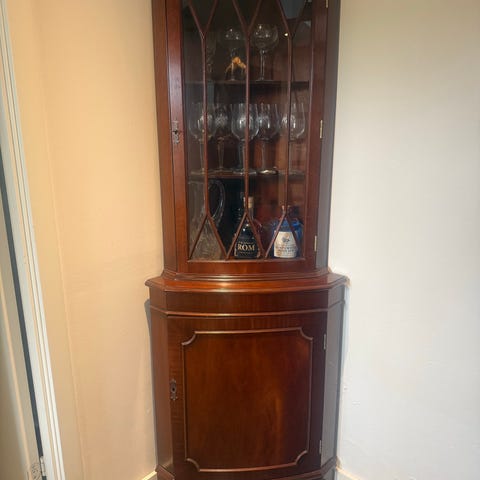 Hjørneskab, b: 95 d: 55 h: 167, Gammelt antik hjørneskab med glas i lågen og hylder indvendig.