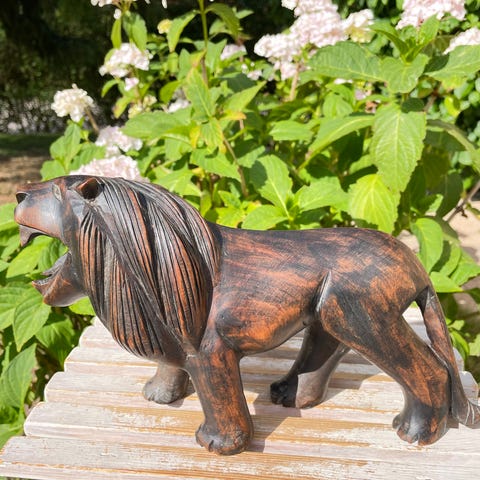 en 11 cm lang løve monteret på træplade af meget ældre dato . brugt men stadig fin .