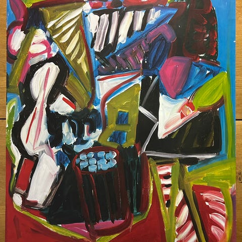 Fin ældre kunstplakat i glas og ramme i rolige farver. Af Dyke Johannsen.