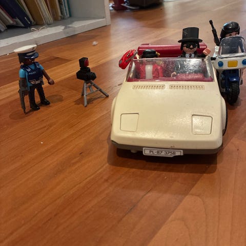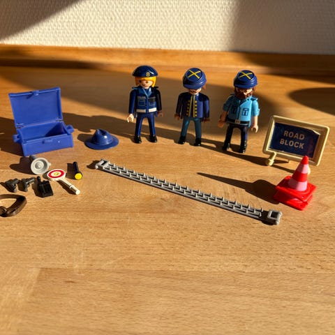Vintage Playmobil brandmænd med økse og hjelme, politi med hjelme og pistoler og tyve med stige, dykker og fiskere med båd...