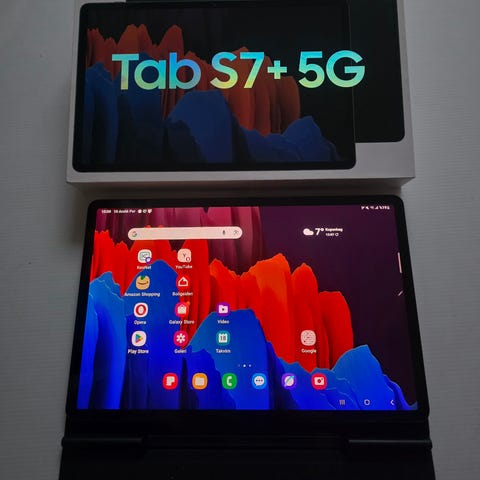 12,4 tommer 120Hz AMOLED skærm. Samsung Galaxy Tab S7+ 5G kommer med en 12,4 tommer 16:10 Super AMOLED skærm med WQXGA 2.800 x 1.752 pixels (277 DPI), og så har den understøttelse for HDR10+. Det indbyggede batteri er på hele 10.900 mAh. 5G og WiFi 6 (802.11 a/b/g/n/ac/ax). S Pen. AKG lyd med Atmos fra fire højttalere. På bagsiden er der et dual-camera. Snapdragon 865+. 8GB RAM.