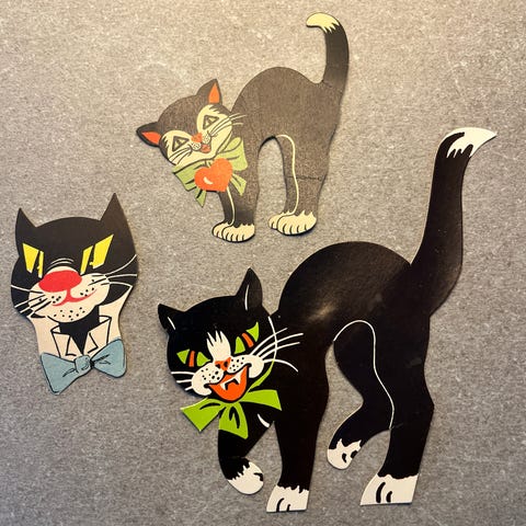 Gammel “farlig” Fastelavnskat, Nok fra 60’erne, dengang katten til fastelavn måtte være “ sur “ og denne er i ret stor størrelse. Se andet opslag med nyere glade papkatte i forskellige størrelser og andet pynt til fx. Et hjemmelavet fastelavns ris, måske med sundere slik eller hvad du nu syntes.