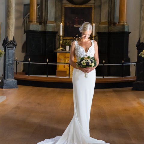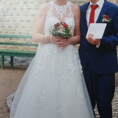 Retro brudekjole i creme hvid! Enkel kjole med flotte blomster-detaljer! Brugt én gang og lagt en del år i skabet ;-) Med mange perler og broderede blomster. Slør og sjal medfølger. Den har én plet nederst foran, men kan måske renses væk. Den har brugsspor og er ikke renset - den mangler derfor at blive renset!