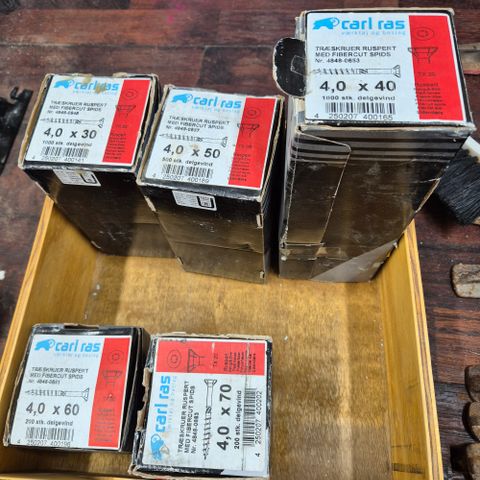 3 æsker med træskruer med fibercut Ruspert tx20 Ø5 med fibercut spids med delgevind i forskellige længder.
