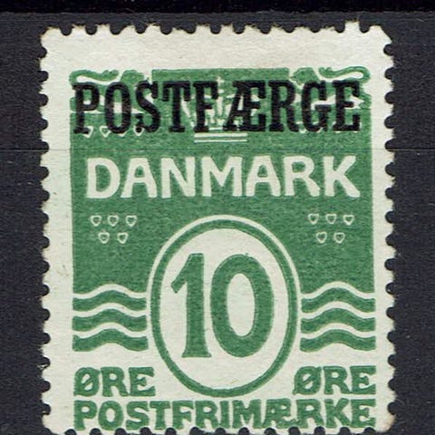 Postfærgemærke Chr.X 1 kr. Mærket som er tæt på postfrisk er med overtrykstype 2. Afa kat. Værdi kr. 1200,- for ubrugt og 2400,- for postfrisk. Mærket findes også overtrykt med overtrykstype 3, her er kat. Værdi 1400,- for ubrugt og 2200,- for postfrisk. Oplag for type 2 er 11.600 og for type 3 er det 14.300 stk. Så det er små oplag.