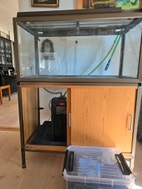 250l 50x 50x 100 brunt akvarie ,porce bord med skydelåger hjemmelavet.. lampehat til lystofrør, 500kr ehiem spandpumpe, oase varme kontrol , fodermaskine .asp luftpumpe og en masse fiting 800kr.