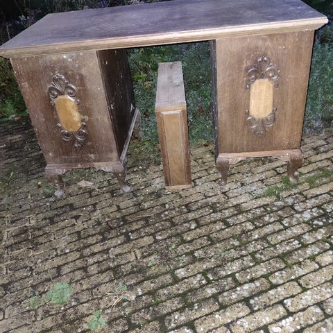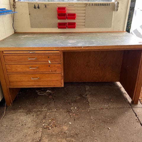 Skrivebord med indbygget boghylde, 6 skuffer - avisholder og stol.