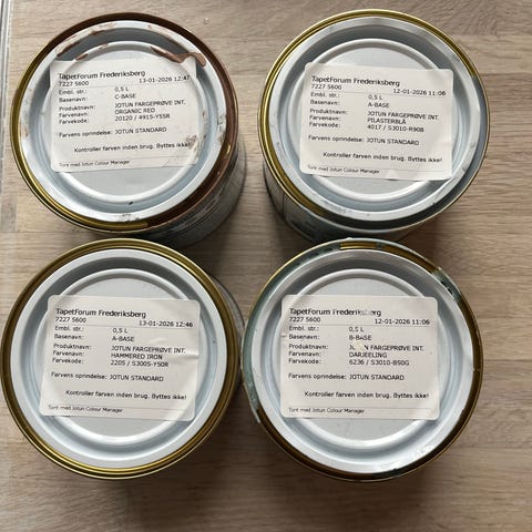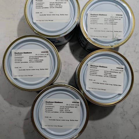 5 Jotun farveprøver i aqua farver. 3 i turkispastelle nuancer, 2 i pastelblå nuancer. Hver dåse rummer 0,4 liter, og de 5 kan sammenblandes til i alt 2 liter.